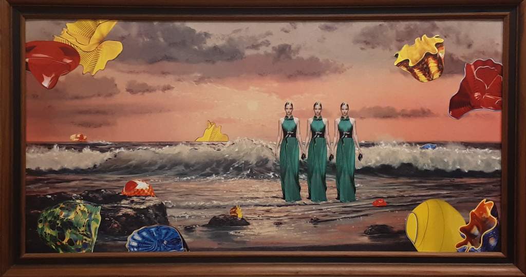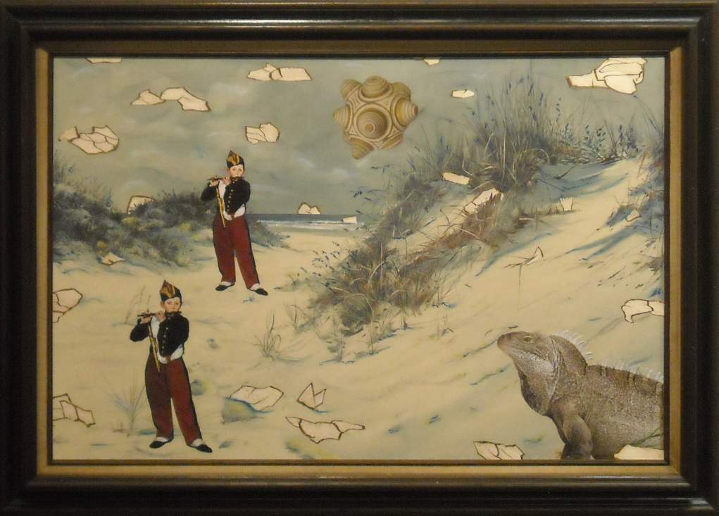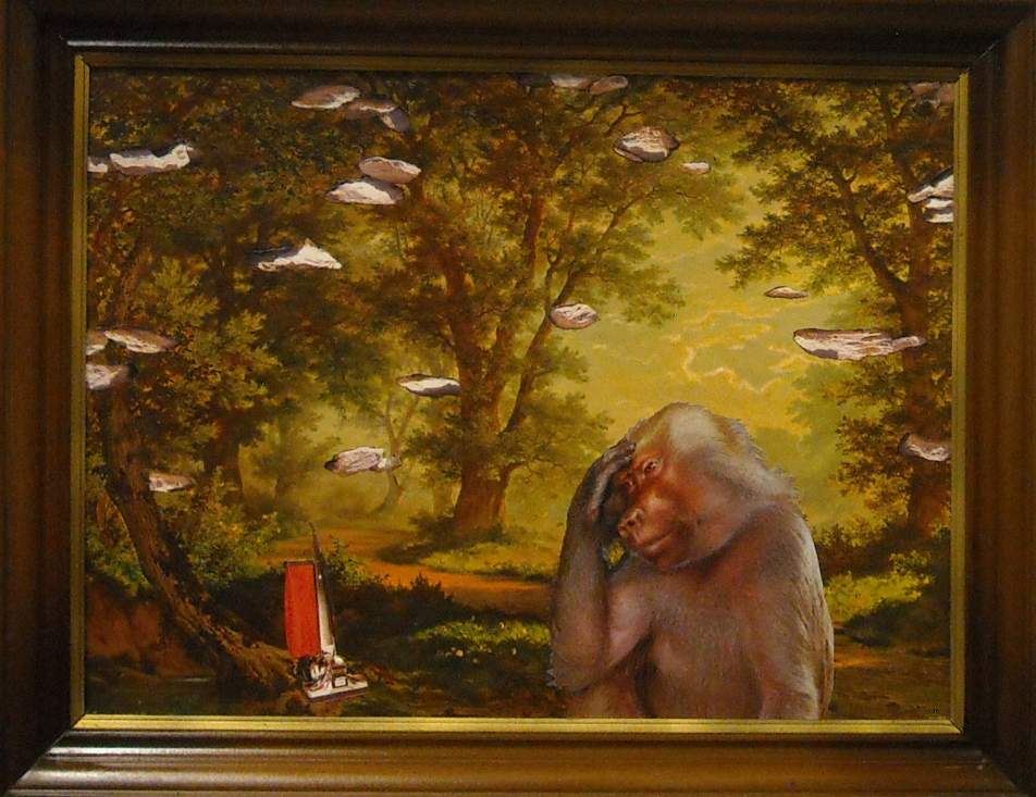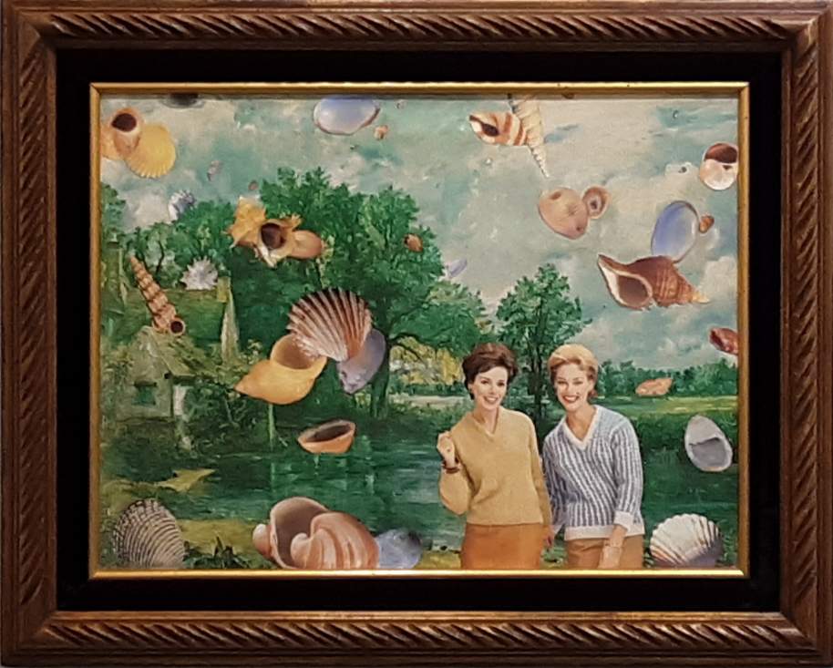 I am a mixed media collage artist from Eau Claire. Using vintage reproduction landscape prints, couch paintings, already completed by paint by number and other paintings, record albums, etc. I add a unique, whimsical touch with new and old images found in magazines, books, and other print materials. I enjoy the challenge of taking an otherwise sedate landscape or picture, and through the addition of images that do not make sense, changing the mood and message.